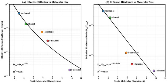 Effective diffusion analysis for alcohol homologs in MIL-125-NH2. (A) Effective diffusion coefficient () versus molecular diameter, demonstrating a power-law relationship with exceptional correlation (). The values span from c/s for methanol to c/s for 1-decanol, decreasing by more than two orders of magnitude. (B) Diffusion hindrance ratio () versus molecular diameter, following a log-linear relationship with , indicating approximately one order of magnitude reduction in relative diffusivity for each 2.4 Å increase in molecular diameter.