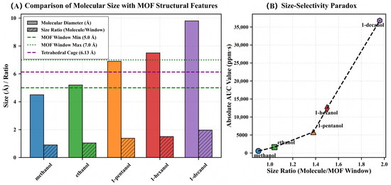 By thoroughly elucidating the complex structure–response coupling mechanism that emerges when alcohol homologs interact with MOF on a QCM sensor system, this study reveals a quantitative correlation that challenges traditional molecular sieve theory. The exponential relationship between molecular mass and response amplitude highlights the compensatory relationship between molecular mass and molecular size. The linear correlation between molecular diameter and adsorption time constant (, ) and the power-law decay of effective diffusion coefficients (, ) provide strong evidence for the activation diffusion mechanism. Considering coexisting factors, a multidimensional mechanism model incorporating molecular conformational flexibility, skeletal structural reactivity, cumulative non-covalent interactions, and multi-domain adsorption pathways resolves the ‘size selection paradox’—where larger molecules exhibit stronger responses despite significant diffusion limitations. This study thus fundamentally transforms our understanding of size-dependent adsorption on microporous sensor surfaces and transforms a seemingly contradictory phenomenon into an opportunity to enhance molecular resolution through strategic adjustments to the structure–performance relationship.