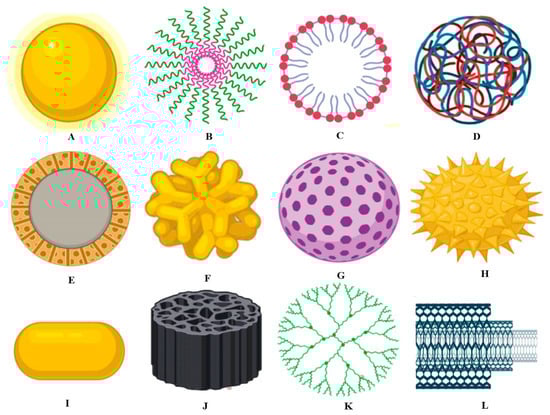 (A) Metallic nanoparticle, (B) polymeric micelle, (C) nanoliposome, (D) polymeric nanoparticle, (E) solid-core mesoporous nanoparticle, (F) branched gold nanoparticle, (G) mesoporous nanoparticle, (H) surface-functionalized nanoparticle, (I) nanorod, (J) porous silica nanoparticle, (K) dendrimer, and (L) carbon nanotube, from [], MDPI 2020.