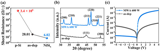 (a) Comparison of the sheet resistance of p-type silicon before and after Ni silicidation using MWA. (b) XRD patterns of Ni films deposited on p-type Si, comparing the as-deposited state with the state after MWA treatment. (c) I–V characteristics of Ni/p-Si Schottky diodes, demonstrating enhanced rectifying behavior following MWA-induced silicidation.