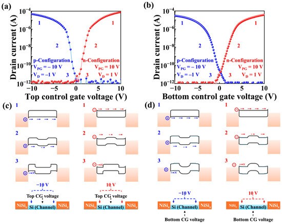 In top CG operation, as shown in Figure 3c, the PG near the source/drain–channel interface enables direct modulation of energy bands in the silicon region adjacent to Ni-silicide S/D, controlling carrier injection. The top CG enhances electrostatic control. A positive VPG pulls down conduction and valence band edges, facilitating electron injection for n-type conduction. A negative VPG raises band edges, allowing hole injection for p-type conduction. The strong band modulation by top CG enables efficient switching due to precise electrostatic control [43].