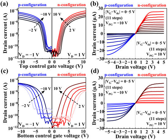 Figure 4b,d present output characteristics measured under fixed VPG values of ±10 V for both control schemes. In top CG mode, ID increased linearly with drain voltage (VD) in the low-bias region and saturated with increasing CG bias, forming well-defined output curves under both polarities. Similarly, the bottom CG operation exhibited ambipolar output behavior, validating that effective polarity switching and channel modulation are realizable with both top and bottom gate control configurations [46,47].