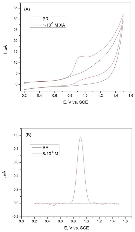 To determine the electrochemical behavior of xanthine at the graphite electrode, cyclic voltammetry and differential pulse voltammetry were performed in BR buffer solution at pH = 3, with and without the addition of XA. The results are shown in Figure 2. The CV curves shown in Figure 2A indicate an oxidation current peak in the presence of XA, suggesting the oxidation of XA. The absence of a reduction peak in the cyclic voltammogram indicates that the oxidation of XA is an irreversible process. The curves obtained during the DPV measurements (Figure 2B) showed a sharp current peak in the presence of XA, which can be attributed to the high sensitivity of the graphite electrode tested, which was made from graphite rods from a spent battery.