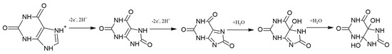 As illustrated in Figure 4A, the cyclic voltammograms recorded in Britton−Robinson buffer solution containing 1·10−3 M XA show that the oxidation process of xanthine is irreversible, since only the oxidation peak is present without the corresponding reduction peak. In the BR buffer solution at pH = 3, xanthine is present as positively charged ions (pKa = 7.45). The process of xanthine oxidation can be explained by the occurrence of electrochemical and chemical reactions in the solution [40]. The electrochemical process involves the transfer of two electrons and two protons to form uric acid. Uric acid immediately oxidizes to the intermediate diimine via a two-electron/two-proton reaction mechanism. The overall reaction of xanthine oxidation involves the participation of 4e− and 4H+ [41]. The intermediate diimine is a highly reactive compound that reacts with an H2O molecule to form an imine alcohol intermediate, which in turn reacts with another H2O molecule to form uric acid-4,5-diol [42]. These reactions are chemical and occur in solution. The entire reaction mechanism of xanthine oxidation, proposed by combining electrochemical and literature [40,41,42] data, can be described using the reactions shown in Figure 5.