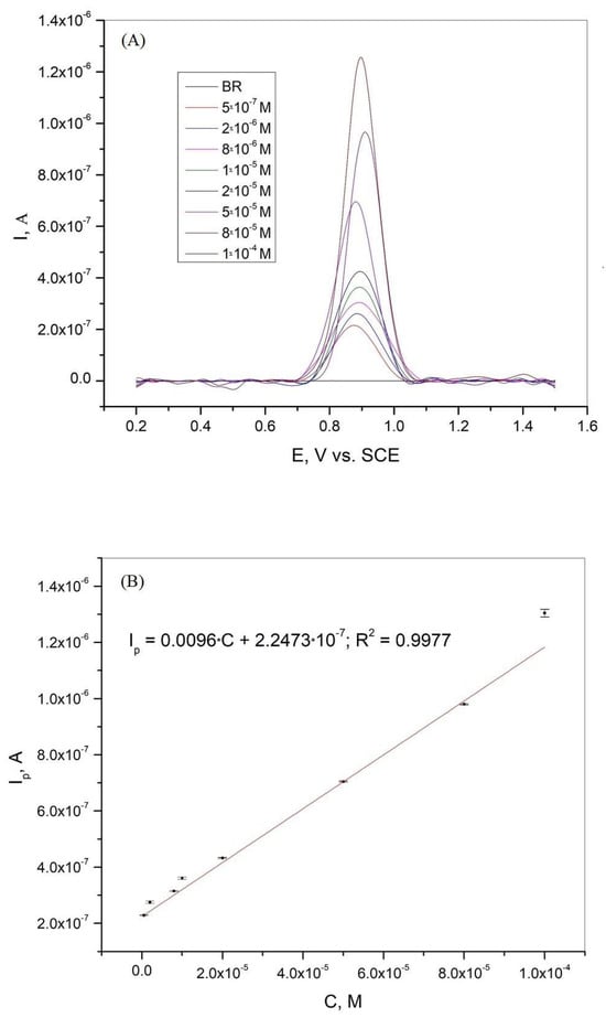 Differential pulse voltammetry was used as one of the most suitable analytical methods to determine the calibration curve, limit of detection (LOD), and limit of quantification (LOQ) for xanthine in the BR buffer solution. Figure 6A shows the differential pulse voltammogram of xanthine at different concentrations in BR buffer solution at pH = 3. The calibration curve obtained from the DPV results is presented in Figure 6B. A linear correlation between the current peaks and concentration was obtained in the range of 5·10−7 to 1·10−4 M. The regression equation with a linear relative coefficient is as follows:
