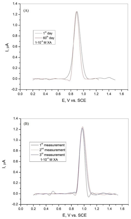 where S is the standard deviation of the peak currents and m is the slope of the calibration curve. The LOD and LOQ values were 7.86·10−8 M and 2.62·10−7 M, respectively. As shown in Figure 6A, the peak potential changed slightly in the presence of different xanthine concentrations. This variation in the peak potential values can be attributed to the complex oxidation mechanism [19,44]. The combination of the complex electrochemical and chemical oxidation processes and the formation of adsorbed products leads to the variation of the peak potential values in the presence of different xanthine concentrations in BR solution at pH = 3.