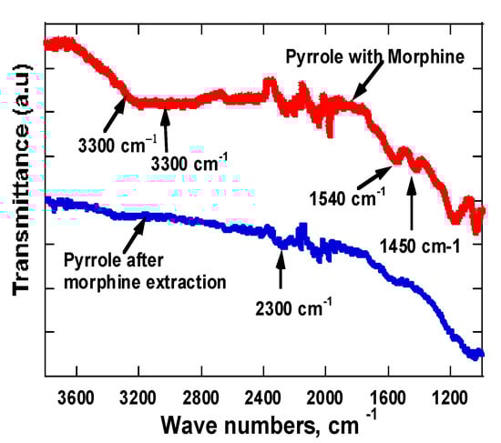 The extraction of morphine from the poly-pyrrole polymer was followed using FTIR. Morphine has well-known stretching and vibrational spectroscopy signatures. A large O-H stretching band is observed at between 3300 and 3500 cm−1. Pristine morphine also has prominent C-H stretching vibrational bands at about 2800–3000 cm−1. Other stretching vibrational modes include the C-O stretching observed at 1700 cm−1. FTIR spectroscopy for morphine trapped in poly-pyrrole is shown in Figure 4. The O-H stretch of morphine was quite broad while trapped in poly-pyrrole, as the peak occurred at 3000 to 3500 cm−1. The carbon double bond vibrational bands of poly-pyrrole are found way below 2000 cm−1 and are, therefore, quite easy to distinguish from those arising from morphine. After extraction of morphine from the poly-pyrrole, the O-H stretching vibrational band disappeared from the spectra. This meant the extraction of morphine was successful.