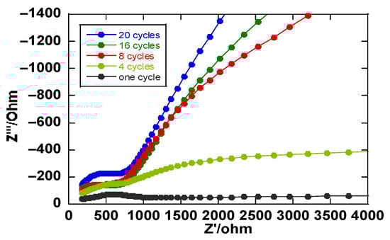 The thickness of the polymer was also monitored using electrochemical impedance spectroscopy (EIS). Change in film thickness results in change in the electron transfer resistance of the electrode and in ESI of the surfaces [30,31]. The electron transfer resistance (Ret), which depends on the dielectric and insulating features of the electrode/electrolyte interface. The EIS technique was carried out in 0.5 mM [Fe(CN)6]−3/[Fe(CN)6]−4 dissolved in pH 5.0 acetate buffer. The Nyquist plot (Z′ versus Z″) obtained at a frequency scan ranging from 100,000 to 1 Hz is shown in Figure 5. Clearly, increasing layers on the polymer film resulted in a disruption of the semicircle. The diameter of the semicircle on the Nyquist diagram does not necessarily change significantly. This region primarily reflects the interfacial electron transfer resistance (Rct). The Rct controls the electron transfer kinetics of [Fe(CN)6]−3/−4 at the electrode surface. We observed a drastic change in mass transfer control with an increasing number of cycles. It appears the mass transfer limitations are more pronounced at lower frequencies than at higher frequencies. It is also reasonable to assume that transfer kinetics are slower on the thicker electrode compared to a less thick one or with a smaller number of cyclic voltammogram scans on the glassy carbon electrode.