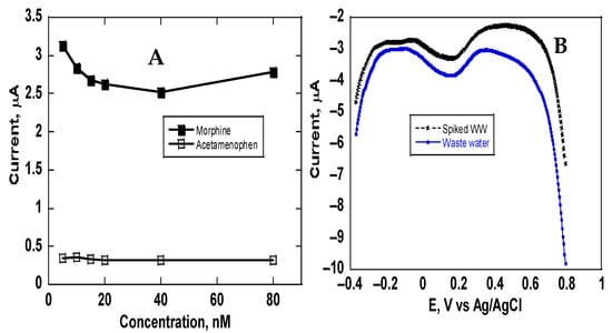 The most common interferants during the analysis of morphine in wastewater or in the blood include oxycodone or other metabolites such as noroxycodone and oxymorphone. Previously, analysis of oxycodone in the presence of morphine was found to not significantly affect the outcome of the results [32]. Other types of drugs present in wastewater are likely to interfere with the detection of morphine. One such drug is acetaminophen, which is an over-the-counter drug mainly used as a painkiller and a common fever reducer. The selectivity of the MIP sensor for morphine was determined by evaluating its response to acetaminophen. The structures of morphine and acetaminophen are slightly different, with acetaminophen being a slightly smaller molecule than morphine and hence easily moving in and out of the prints. As shown in Figure 7A, the current changes obtained with morphine are much higher compared to those from acetaminophen, indicating that the sensor is selective towards morphine.