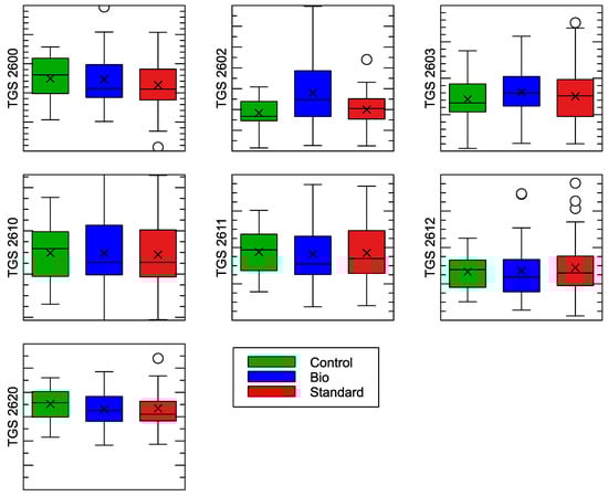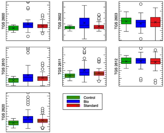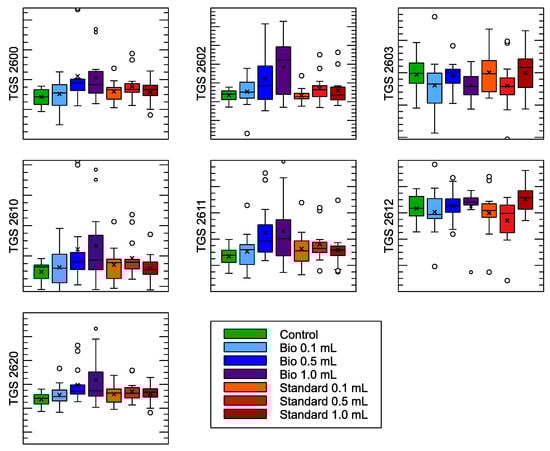 Table 2 presents the results of statistical tests confirming the above-mentioned observation. For the three mentioned sensors, there is a statistically significant difference (at a p-value threshold of 0.05) between Control and Bio samples, as well as between the Bio and Standard samples—the later only for the case of the TGS 2602 sensor.
