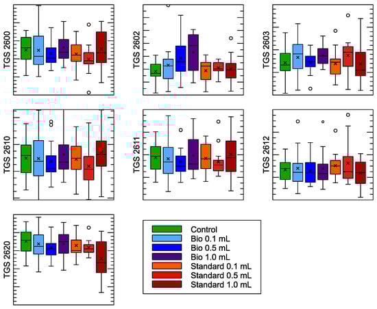 The electronic nose device used in the experiment belongs to the category of low-cost equipment [,]. It consists of a set (Table 1) of the TGS series of gas sensor arrays manufactured by Figaro Engineering Inc. (Osaka, Japan) []. The technical details of the electronic nose construction were described in previous papers [,].