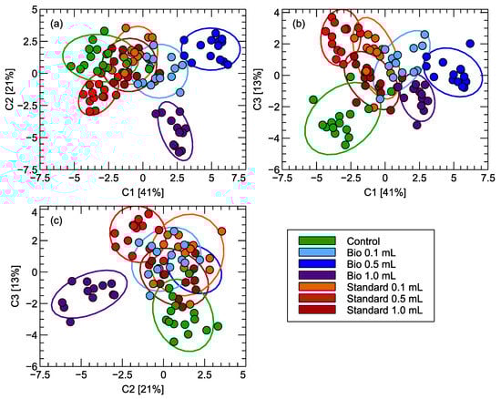 The first pattern that we can observe in Figure 6 is a clear distinction between the control and samples polluted by biodegradable oil. Such a distinction is along all three components, which can be noticed by examining each of the subfigures; however, the first component seems to be dominant. Differentiation of biodegradable oil from control along the secnd component is less pronounced, which can be noticed in subfigure (b) and even more in subfigure (c), in which only the most polluted samples can be differentiated.
