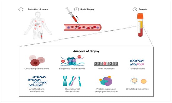 The blood sample is collected from the cancer patient and is screened for the presence of circulating tumor cells (CTCs), alterations at the genetic level (mutations, epigenetic modifications), and changes in proteomic profile and circulating exosomes for detection of cancer and monitoring of given cancer therapy.
