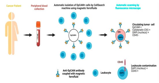 In recent times, various metallic and non-metallic nanostructures have been fabricated and demonstrated for enhanced CTC, EV, cfNA, etc. capture and detection. Magnetic nanoparticles (MNPs) are the classically used nanomaterials for detecting CTCs. Due to their high surface-to-volume ratio, rapid binding kinetics, and stability in solution, nanostructures offer high binding capacity, efficient target capture, and rapid enrichment, making them ideal for use in liquid biopsy to detect CTCs and related components [31,50,51]. The CellSearch system is clinically approved for the detection of circulating tumor cells (CTCs) in patients with breast and colorectal cancers. This system utilizes magnetic ferrofluids for the detection and capture of CTCs from blood samples. It is based on automated immunomagnetic enrichment of epithelial tumor cells that express the epithelial cell adhesion molecule (EpCAM). Specifically, magnetic ferrofluids conjugated with anti-EpCAM antibodies are added to 7.5 mL of peripheral blood collected from the patient, enabling selective isolation of EpCAM-positive CTCs [52,53]. Subsequently, the enriched sample is stained for nuclear staining by immunocytochemistry for cells expressing cytokeratin 8/18/19, whereas pan-leukocyte marker CD45 is utilized for eliminating contaminating leukocytes. Finally, based on consensus guidelines, a trained user using an automated fluorescence microscope captures and quantifies all the cells that meet the criteria for CTCs accordingly. The CellSearch system is highly specific and very sensitive, as it can capture even a single CTC in 7.5 mL of blood with minimal inter-reader variability [54,55,56]. A schematic of the CellSearch system is shown in Figure 2. Recently, Peng et al. and Bai et al. used the HER2 and EpCAM recognition peptide conjugated with MNPs to capture the CTCs expressing these two biomarkers on their surface. These conjugated MNPs demonstrated high capture efficiency and high sensitivity for CTC detection in breast, liver, and prostate cancers, achieving a capturing rate of over 90% for CTCs and 68% for HER2-expressing CTCs and significantly outperforming antibody-functionalized MNPs [30,31].