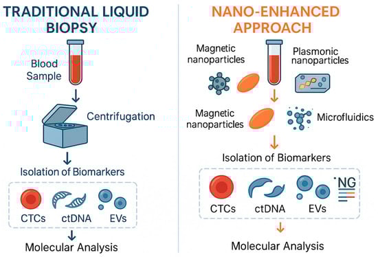Comparison between the workflows of conventional liquid biopsy and the nano-enhanced approach for liquid biopsy.