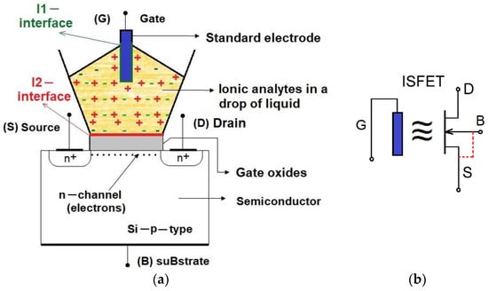 Bergveld, the ISFET’s father, describes the evolution of this transistor after thirty years of existence [51] in conjunction with its integration of sensitive layers. ISFET is essentially a Metal-Oxide Semiconductor Field-Effect Transistor (MOSFET) [52], biasing the gate by a separate connection to a standard electrode placed in an aqueous electrolyte in connection with the gate oxides (Figure 1a). The electronic symbol of an ISFET transistor is presented in Figure 1b and comprises four terminals: S (Source), D (Drain), G (Gate) and B (suBstrate). The red dotted line is used to suggest a frequent situation, when the S and B terminals are connected together inside the transistor capsule, in which case, only three terminals rest outside the capsule: S, D and G [52]. When this red dotted line is not materialized as a short circuit inside the capsule, it must be deleted from the symbol, and the device possesses four distinct terminals: S, D, G and B.