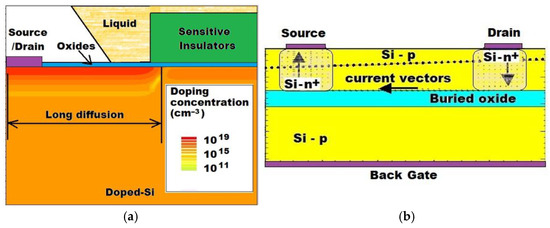 (a) ISFET variant with the source/drain metal laterally spaced by a long diffusion from the gate electrode; (b) SOI ISFET variant with top contacts for source, drain and back gate, in addition to the current vectors in normal working conditions.