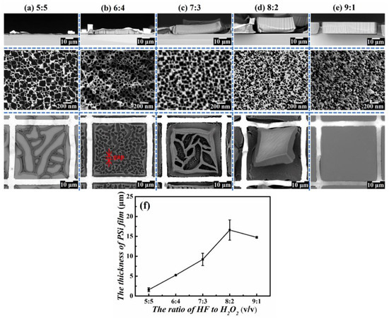 SEM images of a patterned Si geometry for the following etchants ratio R: (a) 5:5, (b) 6:4, (c) 7:3, (d) 8:2, (e) 9:1, respectively (first line presents cross-sectional view, middle: high resolution of top view, bottom: top view); (f) PS thickness as a function of R (redrawn with MDPI permission from [64]).