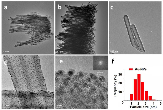 (a) TEM image of the fabricated Psi-NTs; (b–d) different images of Psi-NTs fabricated with uniform distributed gold nanoparticles; (e) high-resolution TEM of Psi-NT Au-NPs containing Fast Fourier Transform (FFT) in inset; (f) the size distribution of the Au-NPs (redrawn with MDPI permission from [65]).
