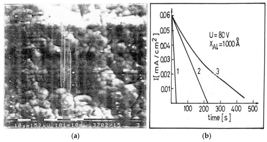 Some experimental tests occurred on discrete structures of porous Al2O3 anchored on a Si wafer, still in the absence of transistor co-integration. The Al film was deposited on a Si substrate over the previous multilayer structure Si/SiO2/Si3N4 under vacuum conditions at a low deposition rate, with a thickness between 80 and 100 nm. This process resulted in the formation of γ-type catalytic Al2O3. Figure 9a presents an SEM image of the porous Al2O3 synthesized layer, while Figure 9b shows the experimental current–time dependence during the Al film conversion into porous Al2O3 by anodization at a constant voltage 80 V in diverse aqueous electrolytes: 1—(HCOO)2, 2—(H3PO4), 3—(HCOO)2: H3PO4 [69].