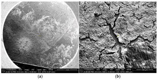 Another oxide material that can be converted by anodizing into a nanoporous or nanostructured material is titanium oxide. Our research group had used nanostructured TiO2 for enzyme immobilization since 2011 [36]. It was later proven that the defects and cracks that appeared above the TiO2 in the enzyme membrane were not caused by the underlying oxide but rather by the adopted cross-linking method [76]. An SEM image of the glucose-oxidase enzyme immobilized on a Si wafer covered by successive layers of Si/SiO2/TiO2/nafion is presented in Figure 10: (a) top view 1 mm scale for the entire wafer covered by enzyme; (b) detail at 0.1 mm scale, revealing cracks and fissures in the enzyme membrane.