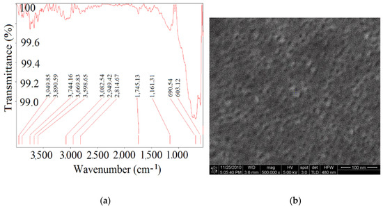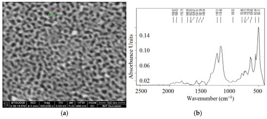 (a) The TiO2 anatase phase achieved on Si wafer in a SEM top view image; (b) ATR-FTIR spectroscopy for the nanostructured TiO2 after anodization (adapted and redrawn with permission from [76]).