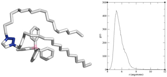 The structural analysis of the representative DODTA–TPB adduct (Figure 1) identifies two predominant types of stabilizing interactions: (1) the π–π stacking between the triazole moiety of DODTA+ and a phenyl ring of TPB−, and (2) multiple C–H∙∙∙π interactions between the flexible C-18 chains of DODTA+ and additional phenyl rings in TPB−. These interactions are consistent with those reported for aromatic systems in aqueous environments, where π–π stacking and C–H∙∙∙π contacts often drive molecular recognition [34]. The boron–nitrogen separation, measured from the central unsubstituted triazole nitrogen in DODTA+ of 5.2 Å in the representative structure, closely aligns with the radial distribution function (RDF) analysis, which shows a peak at 5.4 Å (Figure 1). The RDF analysis quantifies the probability of finding the boron atom of TPB− at a given distance from the representative nitrogen atom of DODTA+, confirming the dynamic yet stable nature of the adduct. This consistency supports the validity of the proposed representative structure and highlights the key molecular interactions responsible for the stability and functionality of the DODTA–TPB ion-pair.
