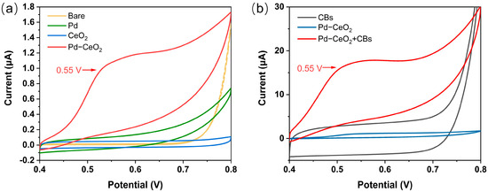 The electrocatalytic activity of the Pd-CeO2/CB composite material was evaluated using CV and amperometry with a CHI 660E electrochemical workstation. CV was performed with a scan rate of 50 mV/s within a potential window of 0.4 V to 0.8 V. Amperometry was conducted at a constant potential of 0.55 V for 100 s to record the change in current.