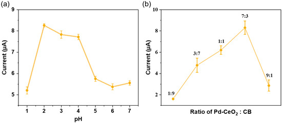 (a) Effect of different pH on Sunset Yellow test; (b) effect of different Pd-CeO2–CB mass ratios on the Sunset Yellow test.