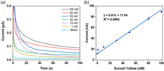 Building upon the optimized experimental conditions described above, this study further evaluated the sensitivity of the Sunset Yellow electrochemical sensor. Specifically, a series of Sunset Yellow standard solutions with concentrations ranging from 1 to 100 nM was prepared using a pH 2.0 phosphate buffer solution. Amperometry was then used to detect the different concentrations of Sunset Yellow at a constant potential of 0.55 V. As shown in Figure 5a, the sensor’s response current increased with the gradual rise in Sunset Yellow concentration over the 100 s test period. The sensor can still produce a clear response signal even at a Sunset Yellow concentration as low as 1 nM. This fully demonstrates that the Sunset Yellow electrochemical sensor has high sensitivity and rapid response, and can detect trace amounts of Sunset Yellow.