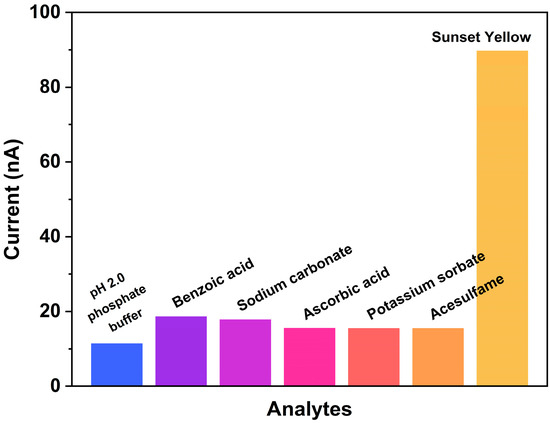 The interference of co-existing components in fruit juice beverages on Sunset Yellow detection was investigated to evaluate the sensor’s selectivity in complex systems. Since various fruit juice beverages often contain multiple additives (to ensure the freshness, flavor, and taste of the beverage), the testing environment for fruit juice samples is quite complex. Benzoic acid (BA), sodium carbonate (SC), ascorbic acid (AA), potassium sorbate (PS), and acesulfame were selected as interfering substances, and 100 nM of Sunset Yellow and 100 nM of the interfering components solution were prepared in a pH 2.0 phosphate buffer solution. Then, the current response of each solution was measured using amperometry at a potential of 0.55 V, and the results are shown in Figure 6.