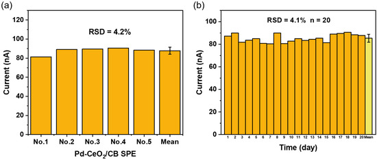 (a) Reproducibility and (b) stability of the Pd-CeO2/CB sensor for the measurements of Sunset Yellow.