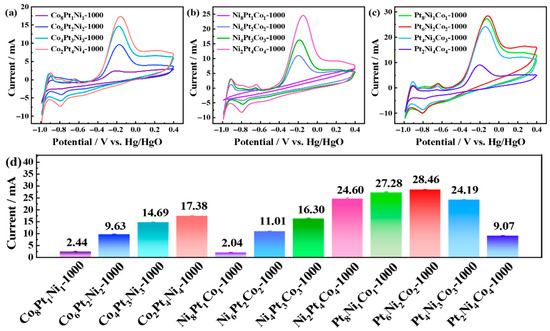 (a) The CV curves of Co8Pt1Ni1-1000, Co6Pt2Ni2-1000, Co4Pt3Ni3-1000, and Co8Pt1Ni1-1000 electrodes in 1 M KOH in the presence of 0.1 M NH4Cl; (b) the CV curves of Ni8Pt1Co1-1000, Ni6Pt2Co2-1000, Ni8Pt1Co1-1000, and Ni8Pt1Co1-1000 electrodes in 1 M KOH in the presence of 0.1 M NH4Cl; (c) the CV curves of Pt8Ni1Co1-1000, Pt6Ni2Co2-1000, Pt4Ni3Co3-1000, and Pt2Ni4Co4-1000 electrodes in 1 M KOH in the presence of 0.1 M NH4Cl; (d) the current density of different electrodes.