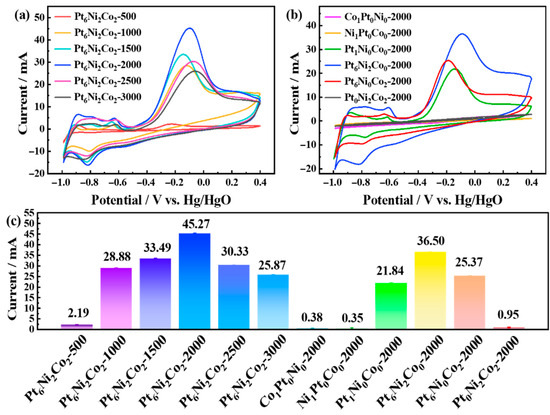 Based on the ECSA, the oxidation peak current densities of the Pt6Ni2Co2-2000 and Pt1Ni0Co0-2000 electrodes have been obtained with values of 5.30 mA cm−2 and 3.94 mA cm−2 (Figure 5a), proving that Pt6Ni2Co2-2000 exhibited the larger ECSA and higher current densities than that of the Pt1Ni0Co0-2000 electrode and further proving that the formation of a Pt-based alloy could improve electrocatalytic performance.