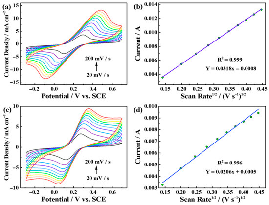 (a) Pt6Ni2Co2-2000 and (c) Pt1Ni0Co0-2000 electrodes in 0.1 M KCl containing 5.0 mM [Fe (CN)6]3− at different scan rates from 20 to 200 mV s−1. The linear relationship between the oxidation peak current and the square root of the scan rate of (b) Pt6Ni2Co2-2000 and (d) Pt1Ni0Co0-2000 electrodes.