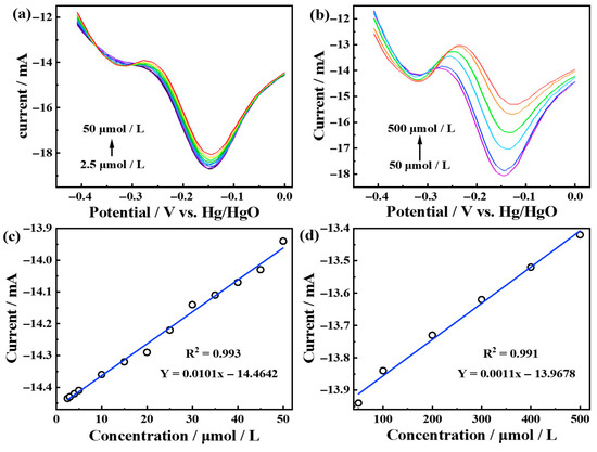 (a,b) DPV curves in 1 M KOH with ammonia–nitrogen concentration from 2.5 µM to 50 µM and from 50 µM to 500 µM; (c,d) fitted curve of currents and ammonia–nitrogen concentrations.