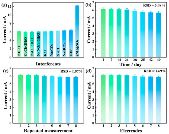 To comprehensively evaluate the sensing capabilities of the Pt6Ni2Co2-2000 electrode, differential pulse voltammetry (DPV) measurements were systematically performed across a broad concentration range of ammonia–nitrogen. As depicted in Figure 6a,b, well-defined oxidation peaks at approximately −0.25 V exhibited a concentration-dependent increase in current response. Quantitative analysis revealed excellent linear correlations between peak current and ammonia–nitrogen concentration in both the low (2.5–50 μM) and high (50–500 μM) concentration ranges, with corresponding regression equations of Y = 0.0101x − 14.4642 (R2 = 0.993) and Y = 0.0011x − 13.9678 (R2 = 0.991) (Figure 6c,d). The sensor demonstrated remarkable sensitivity (10.01 μA μM−1) and achieved a detection limit of 0.688 μM (S/N = 3) [26]. The performance of reported electrochemical ammonia–nitrogen sensors are summarized in Table S2 in the Supplementary Materials, indicating that Pt6Ni2Co2-2000 showed excellent sensing performance.