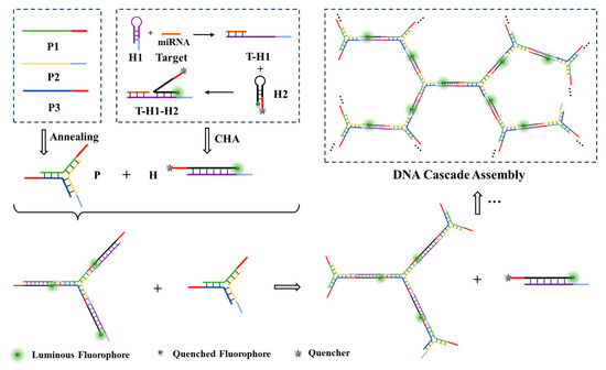 - Li, C.; Zhang, J.; Gao, Y.; Luo, S.; Wu, Z. Nonenzymatic Autonomous Assembly of Cross-Linked Network Structures from Only Two Palindromic DNA Components for Intracellular Fluorescence Imaging of MiRNAs. ACS Sens. 2022, 7, 601–611. [Google Scholar] [CrossRef] [PubMed]