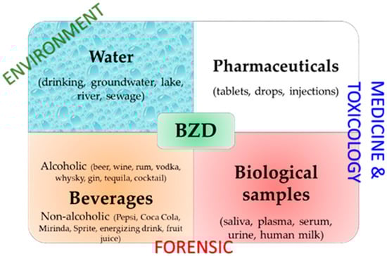 However, there is an increasing need to develop portable, cost-effective, rapid, sensitive, and selective BZD detection devices for various samples (Figure 2) [28]. Electrochemical sensors are often the right choice in this respect because they have rapid response times, are usually quite easy to prepare, have various preparation methods, and can be miniaturized. Additionally, they can have various designs [29] and can be coupled with different techniques to obtain low detection limits and linear ranges wide enough to be applied for the accurate analysis of multiple types of samples.