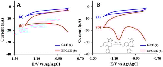 Cyclic voltammetric investigation of ALP at HMDE indicated a cathodic peak at about −0.95 V (PBS pH 7.00) attributed to the irreversible, adsorption-controlled reduction of the azomethine group involving 2e− and 2H+ according to the reaction presented in Scheme 1(a) [28]. Similar behavior was reported on BDDE [42] and CPE [43], but in this case, the ALP reduction process was diffusion-controlled (Scheme 1(b)). Among the solid electrodes, the most widely used is the GCE. At bare GCE, ALP did not show any voltammetric signal, but after the electrochemical pretreatment of the electrode (Figure 3), a well-defined cathodic peak was observed (Figure 4). This difference between ALP’s electrochemical behavior at the two investigated working electrodes was attributed to a better adsorption of the analyte on the EPGCE due to its increased electroactive surface area and the presence of oxygen-containing groups that could interact with the analyte through hydrogen bonds (Figure 4). EPGCE was applied to ALP determination from six non-alcoholic and alcoholic spiked drinks without interference from substances such as ascorbic acid, citric acid, sucrose, and acetaminophen, which are commonly contained in beverages used in sexual assault cases. Applying the standard addition method, the recoveries obtained were between 82.0 ± 0.2 and 109.0 ± 0.3% [39].