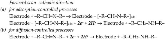 CV studies of BZP at BDDE emphasized that, only in the direct scan, one peak due to the 2e− and 1H+ diffusion-controlled, irreversible reduction of the azomethine group, most probably with the generation of a radical anion [42]. At CPE, the BZP reduction process proceeded according to Scheme 1(a) [43].
