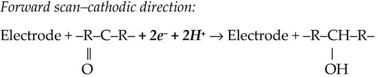 Electrode reaction involved in the electro-reduction of the >C=O moiety [50].
