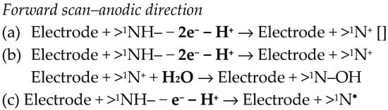 Some investigations explore more negative potentials, recording the cathodic signal (R3) generated by reduction of the 4,5-azomethine group (Scheme 1) [48,50]. Moreover, one paper also indicated a cathodic signal, at about 0.3 V, generated by the reduction of the >C=O group (Scheme 3). However, for quantitative purposes, the -NO2 reduction signal was exploited the most [50].