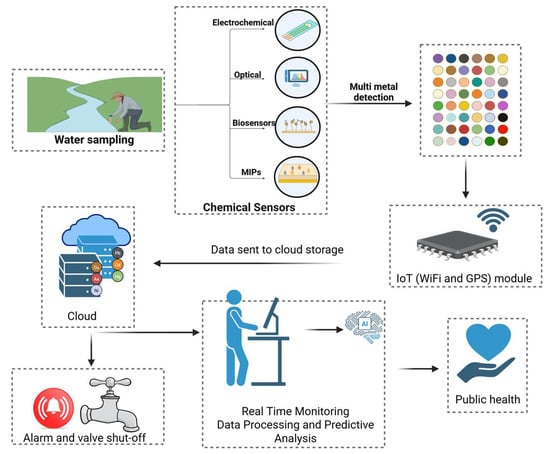 Wastewater pollution with hazardous substances poses significant environmental and public health risks, requiring thorough monitoring. Sensors play a vital role in detecting and measuring these pollutants, including electrochemical, optical, biosensors, and molecularly imprinted polymer (MIP) sensors. While conventional sensors offer accuracy, real-time monitoring systems are more portable, durable, cost-effective, and energy-efficient [87]. An integrated overview of real-time heavy metal detection in wastewater is presented in Figure 2.