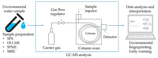 Due to the growing complexity of environmental samples and the emergence of contaminants of emerging concern (CECs), often unknown, unregulated, or present at trace levels, analytical methods must be improved over time. In response, GC-MS evolved into a powerful chemosensing platform capable of delivering both targeted and non-targeted insights [,,,]. Modern approaches utilize the total ion chromatogram (TIC) and total ion mass spectrum (TIMS) not only for compound identification but also as holistic chemical signatures of the sample. These rich datasets are often interpreted using multivariate statistics and machine learning (ML) algorithms, enabling the classification of water samples based on pollution patterns even in the absence of individual analyte identification.