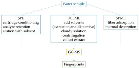 Schematic workflows of selected sample preparation techniques for GC-MS chemosensing of water samples.