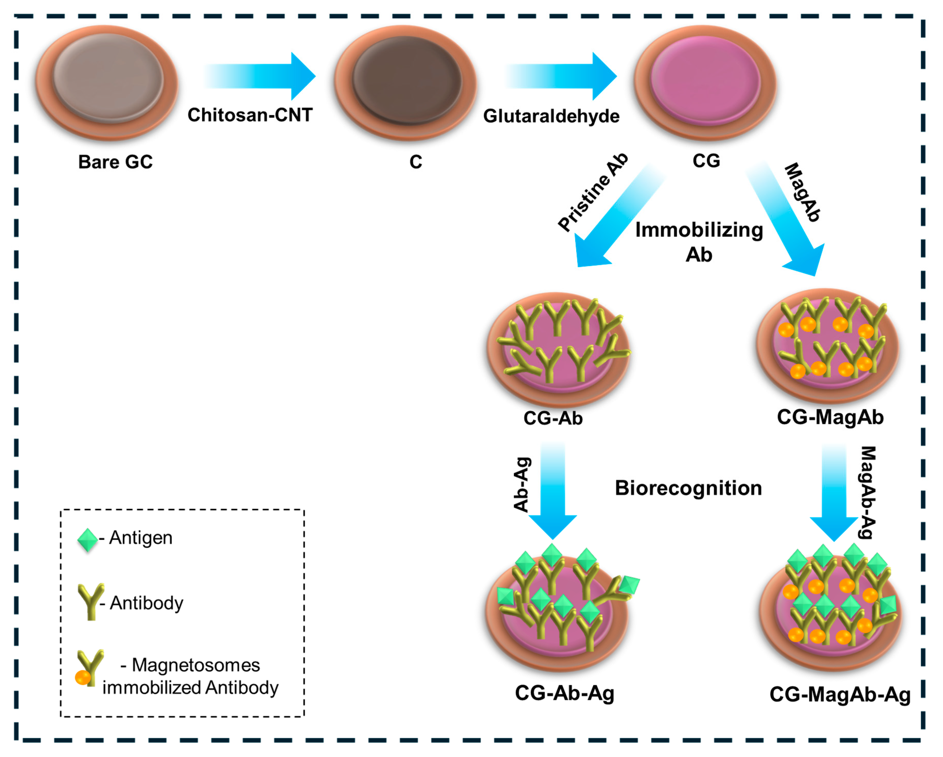 Briefly, the glassy carbon electrode was coated with a solution of 0.5% Chitosan and single walled carbon nanotubes (CNT). CNTs are being used such that they increase the binding affinity. After an incubation of 60 min, the electrode was immersed in 25% glutaraldehyde solution to enhance the binding nature of the biological entity. Then, 10 µL of antibody (0.8 µg/mL) with or without magnetosomes was deposited onto the surface of a glassy carbon electrode and incubated at 4 °C for 20 min. In this work, the high concentration of (25%) glutaraldehyde was used to cause the over-cross linking, minimizing the flexibility of chitosan/CNT as well as the potential loss of activity of antibodies if directly exposed. The 25% treatment was only applied to the chitosan-CNT layer (before antibody immobilization), this may have been performed to create a very stable anchoring network and not directly interact with the antibody layer at the same time, antibody immobilization was performed at low temperature (4 °C, 20 min), which may minimize activity loss. Finally, the glassy carbon electrode surface was coated with lipopolysaccharide (Salmonella 0.01–0.5 µg/mL and E. coli 0.01–1 µg/mL) and the electrochemical response was measured. Hereafter the electrode modification of chitosan with CNTs are denoted as C, further modification with glutaraldehyde is denoted as CG, on immobilization with antibody and magnetosomes modified antibody are denoted as CG-Ab, CG-MagAb, further biogenic interactions with corresponding antigens are denoted as CG-Ab-Ag and CG-MagAb-Ag.