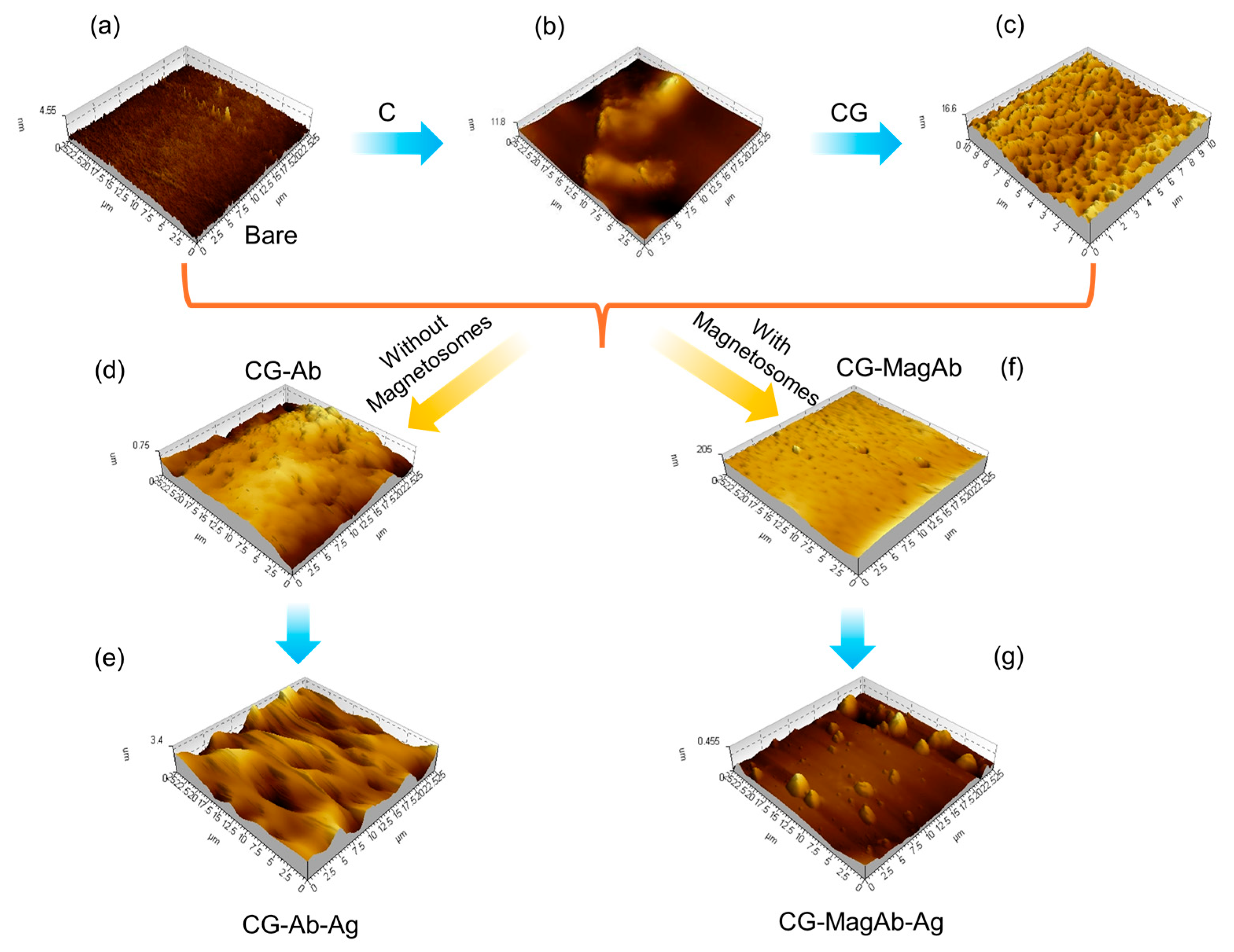 Figure 3. AFM analysis using Tapping mode to image layers in sensor fabrication and use: (a) Bare glass plate; (b) Modification with chitosan and single walled carbon nanotubes (C); (c) Coating the modified glass side with Glutaraldehyde (CG); (d) Immobilizing the surface with antibody (CG-Ab); (e) Antigen–antibody interaction (CG-Ab-Ag); (f) Immobilizing the surface with magnetosomes coated antibody (CG-MagAb); (g) Antigen-magnetosome-antibody interaction (CG-MagAb-Ag).