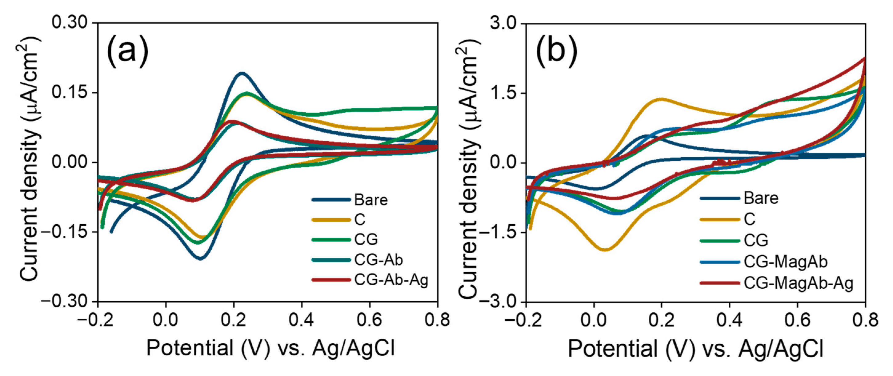 CV experiments were used to further confirm the surface changes for the attachment of antibody and antigens (Salmonella and E. coli) in the fabricated immunosensor. Theoretically, the changes in peak current and the separation between peak potentials in voltammograms obtained for modified electrode surfaces are related to the electron-transfer rate constant [56]. Figure 4a,b shows the cyclic voltammograms of modified GCs obtained under the following conditions: (i) bare; (ii) modification with C; (iii) CG; (iv) immobilization with antibody/magnetosome immobilized with antibody; (v) linking with concentration of antigen (Salmonella 0.01 µg/mL and E.coli 0.01 µg/mL) in the solution of 1 mM [Fe(CN)6]3−/4− and 0.1 M KNO3 prepared in 10 mM PBS (pH = 7.4). It is evident that the increase in peak potential and peak current is noted as the electrode is modified continuously. It also suggests that the surface is confined, and reversible diffusion occurs. The layer-specific controls indicate that this feature primarily arises from surface-confined oxidative processes within the chitosan/glutaraldehyde film, with a minor contribution from magnetosome Fe(II)/Fe(III) surface chemistry on GC/CGMagAb. The peak is therefore a film/electrostatic charging and redox signature of the modified interface rather than a mediator-driven faradaic process in solution.