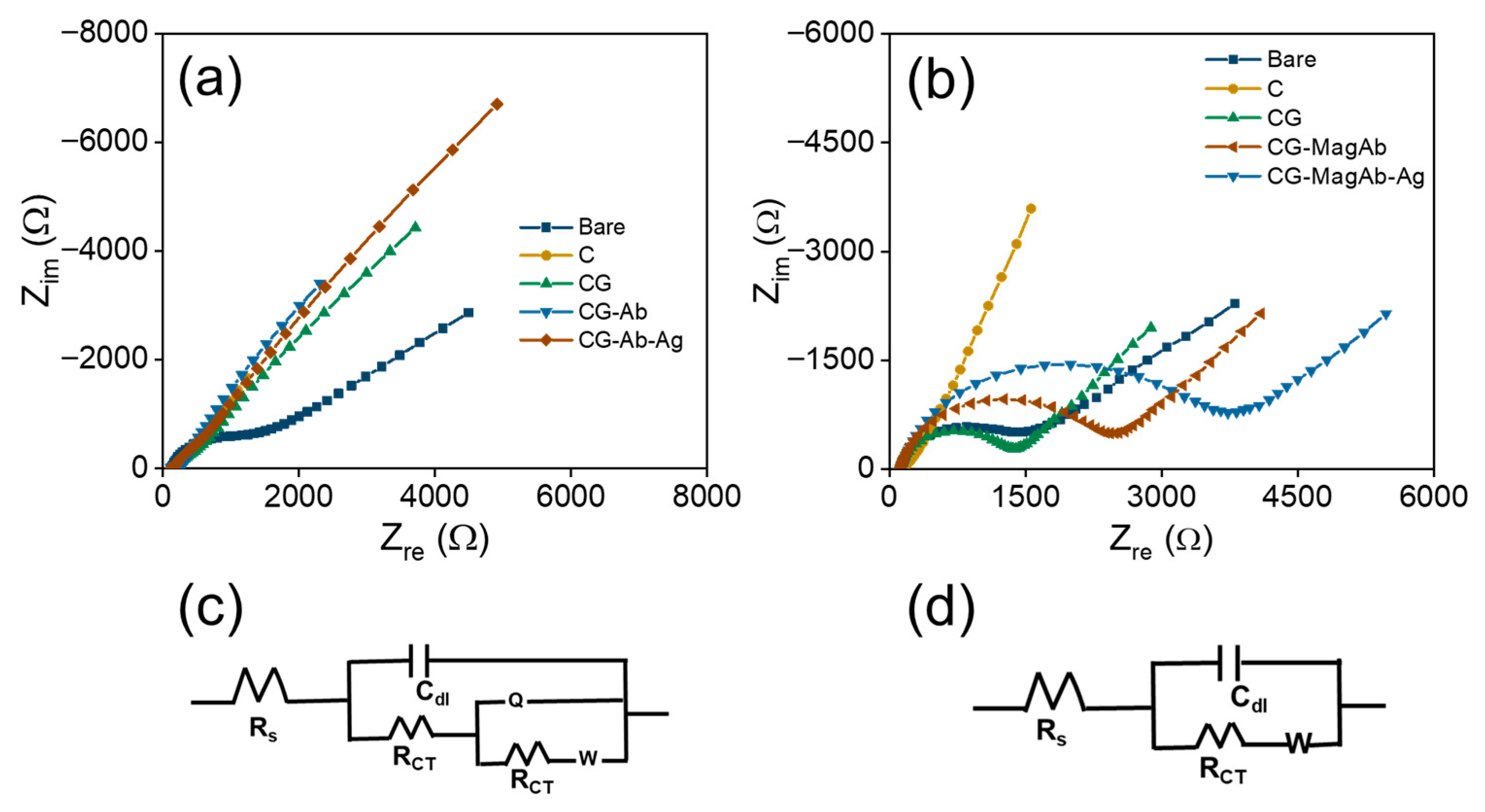 Figure 5. Nyquist plots: (a) CG-Ab-Ag, (b) CG-MagAb-Ag modified GC electrodes within the frequency range from 0.1 Hz to 100 kHz. A sinusoidal potential modulation of ±10 mV amplitude was superimposed on the open circuit potential. Electrolyte: 1 mM Fe(CN)63−/4− and 0.1 M KNO3 as a supporting electrolyte in 10 mM PBS (pH = 7.4). (c,d) The corresponding equivalent circuit of the fabricated electrodes.